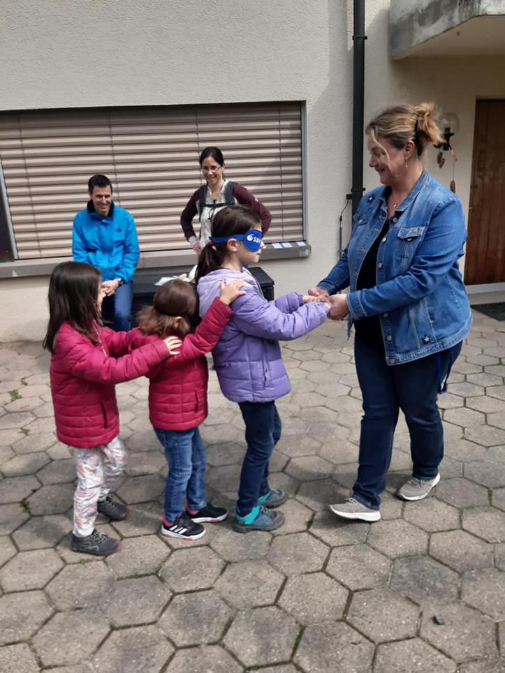 Schmecken, Riechen, Hören, Fühlen und Sehen oder eben nicht sehen, alle haben sich auf die Experimente eingelassen, manchmal war die Augenklappe höher oder tiefer aufgesetzt . Die Kinder hatten grosses Vertrauen in sich selbst und sie haben alle Posten mit grossem Elan gemeistert. Sei es blind jemanden vertraut, gefühlt ob es stachelig oder weich war, geschmeckt ob es süss oder salzig war, gehört welche Geräusche ausserhalb der Mauern hörbar sind oder mit der Nase gerochen wie Löwenzahn riecht.