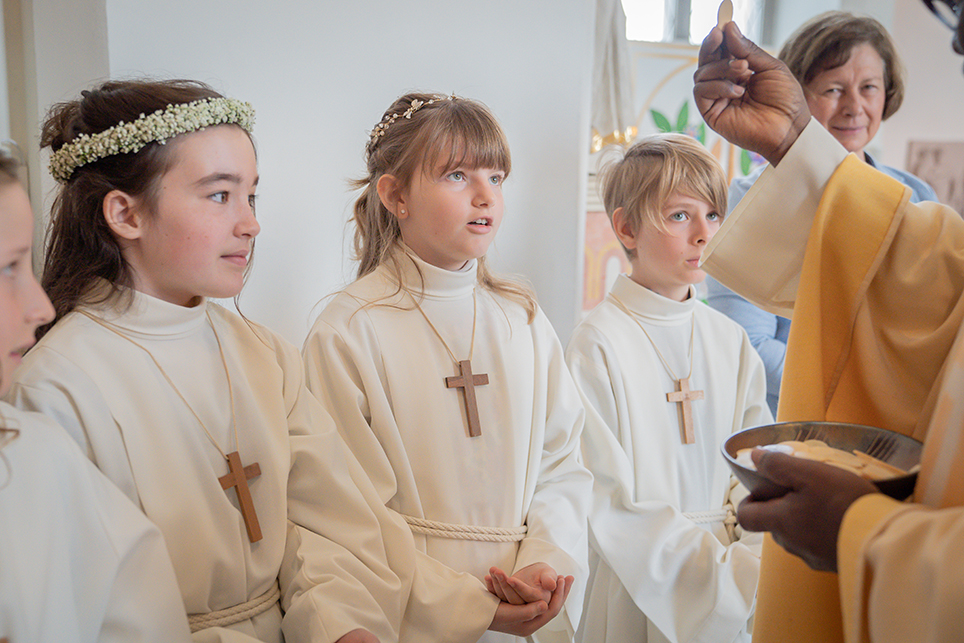 Im feierlichen Licht ihrer Taufkerzen erneuerten die Kinder dann ihre Taufe mit ihren eigenen Worten. Der Priester bestätigte diese und segnete sie. Ein glücklicher und besonderer Moment war das. Ganz viele Fürbitten hatten die Kinder selber zusammengetragen und beteten diese mit uns Allen. Zum Höhepunkt des Festgottesdienstes trugen die Kinder die Gaben zum Altar. So konnten sie jetzt zum ersten Mal ganz nah mit Jesus Christus Tischgemeinschaft erleben, im Sakrament der Eucharistie. Von unserem Priester durften sie dann das Heilige Brot empfangen. Strahlende Gesichter und glänzende Augen waren zu sehen. Es war dann auch ein herzerwärmender Moment, als die Väter ihren Kommunionkindern die selbst gefertigten und gesegneten Kreuze schenken durften.
