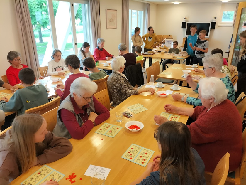 Religionsunterricht mal anders. Der Titel ist ein Ausschnitt aus dem Lied, mit dem die Schüler/innen die Gäste am Spielnachmittag begrüssten. Die Schüler/innen haben mit selbst gestalteten Einladungen zu den Spielnachmittagen in die Schlossmatte eingeladen. Nach einer kurzen Begrüssung und Vorstellungsrunde setzen sich die Jungen zwischen die älteren Personen. Da wurde gejasst, es wurde DOG gelernt, Uno und «vier gewinnt». Auch ein Lottonachmittag stand auf dem Programm. Drei kurzweilige, generationenverbindender Anlässe haben allen Freude und Spass gemacht.