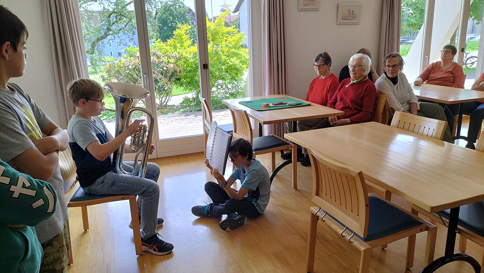 Jede der 5./6. Klassen durfte im Religionsunterricht zu einem Spielnachmittag einladen. Um 15.00 Uhr begrüssten die Schülerinnen und Schüler mit einem Lied oder mit einem Musikstück die anwesenden Leute und stellten sich vor.