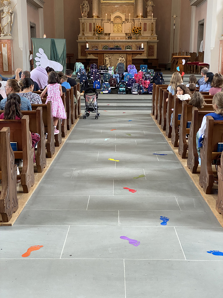 Am Samstag und Sonntag 17./18. August war es wieder soweit. Viele Familien fanden den Weg in die Kirche und warteten mit Spannung was hier wohl passieren wird. Eine gewisse Aufregung, ja Spannung lag in der Luft. Diese besondere Aura des Sonntags vor Schulbeginn was spürbar im Kirchenraum. Ob der kommende Montag schon Routine ist, oder etwas ganz Neues auf mich wartet. Dieses Gefühl kennen alle die hier zusammengekommen sind ob Gross oder Klein. Alle haben ihre Erinnerungen an diesen Tag. Mit schönen Worten, klangvollen Liedern und passenden Texten hatten die Vorbereitungsgruppen der künftigen Erinnerung etwas Nahrung gegeben. Die Kinder gaben ihrer Vorfreude, ihren Erwartungen oder auch ihrem Respekt Ausdruck. Die vielen Notizen im grossen Fuss zeugen davon, was die Kinder bewegt. Am Ende der Feier durften die Kinder ihre Schultaschen und Rucksäcke anziehen und den ganz persönlichen Segen für ihr kommendes Schuljahr erhalten. Gesegnet und gestärkt verliessen alle die Kirche um vielleicht noch die allerletzten Vorbereitungen zu treffen.