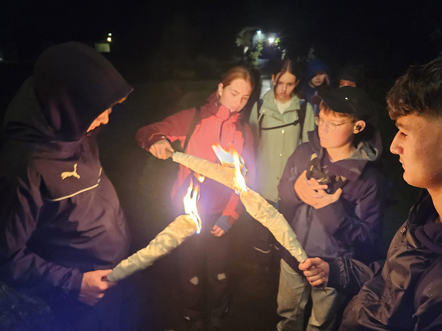 Gestartet wurde in der Kirche Inwil mit dem Thema Vergangenheit. Resultat war ein Holzscheit, beschriftet mit Menschen und Dingen, die gerne losgelassen werden möchten. Damit ausgerüstet machten sie sich auf den Weg ins Pfarrhaus Eschenbach. Vor Ort wurde eine Fackel gebastelt, Suppe gegessen, Fragen zur Gegenwart beantwortet und in der Kirche Gott bei einem Weihrauchritual Fürbitten anvertraut. So ging der Weg, erleuchtet durch Fackeln, weiter Richtung Gibelflüh. Dort wurde ein Feuer entzündet und die belastende Vergangenheit dem Feuer übergeben. Und später noch Schlangenbrote gebacken, ein Bild der Zukunft gemalt und etwas ausgeruht. Schliesslich wurde die letzte Etappe unter die Füsse genommen – die Pfarrkirche Ballwil. Dort wurden auch diese Jugendlichen persönlich für die Zukunft gesegnet. Bei einem «Zmorge» mit müden, aber glücklichen Gesichtern klang dieser Anlass aus.