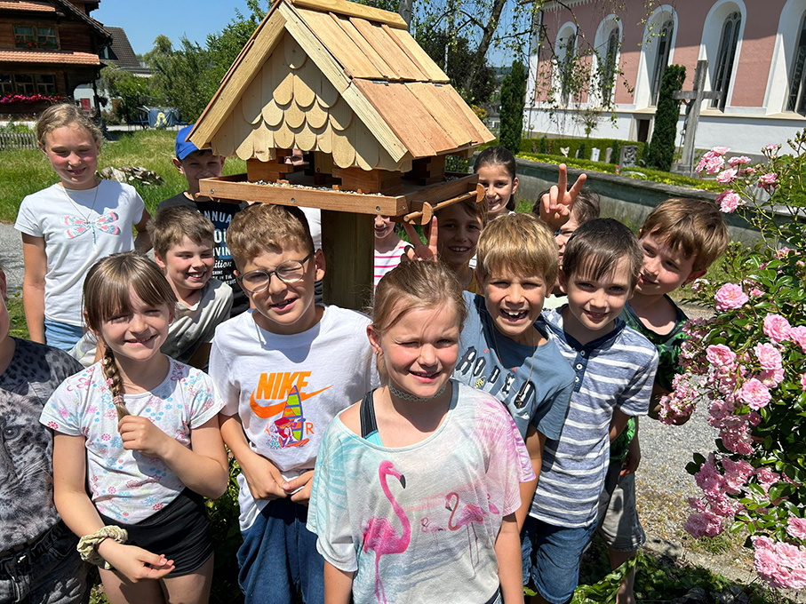 Die wunderschöne Vogelfutter-Villa hat ihren festen Platz im Pfarrgarten und freut sich auf viele piepsende Freunde!