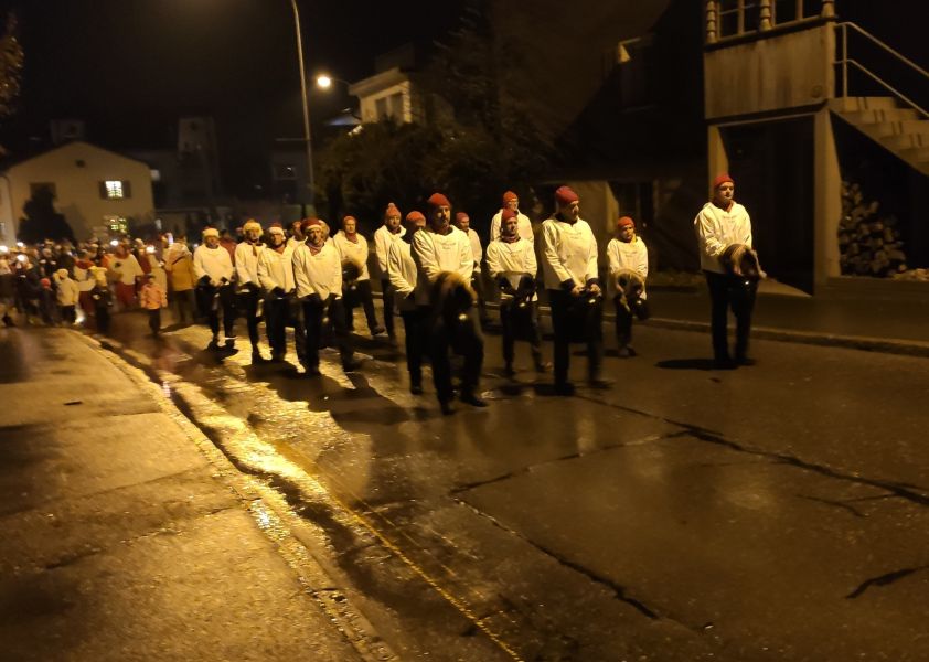 Voran eine stattliche Anzahl Trichlenschwinger und dann die Kinder und Erwachsenen mit Fackeln und Laternen. So begleiten sie den Samichlaus durchs Dorf hinauf auf den Margrethenplatz. Dort begrüsst der Samichlaus alle zusammen und darf auch schon die ersten Verse hören. Dankbar stärken sich alle mit Punsch und Wienerli/Brot gesponsert vom Gewerbeverein bevor es dann auf den Heimweg oder weiter durchs Dorf geht. Das Geläut der Trichler war bis in den späten Abend im Dorf zu hören…ob der Samichlaus da schlafen konnte? 😊