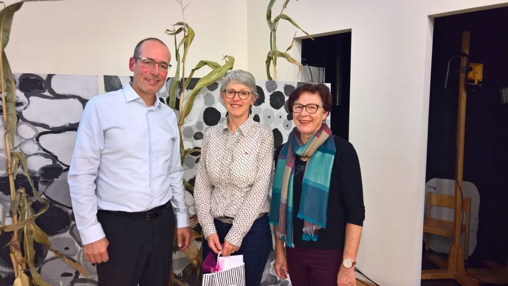 Bildlegende: Rosmarie Manzocchi und Rosmarie Isaak (r) erhalten von Thomas Odermatt, Kirchgemeindepräsident, ein Dankeschön für ihre langjährige Kommunikationsarbeit.