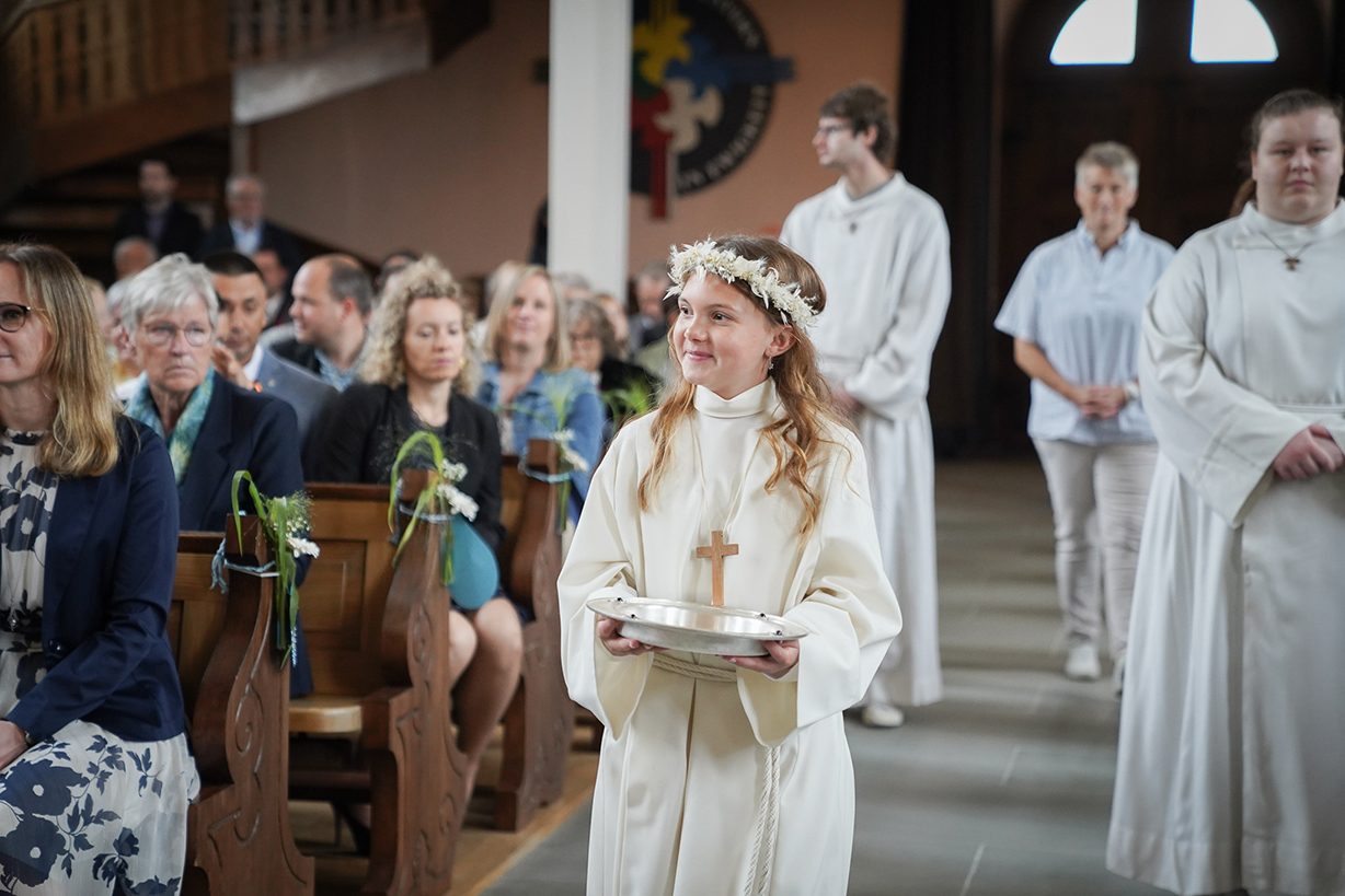 Für diesen besonderen Festtag wurde das «ganz grosse Programm» aufgefahren: eine von den Kindern und Müttern sehr schön geschmückte Kirche, eine grosszügig festlich aufspielende Musikgesellschaft, ein langer Einzug durchs Dorf mit Fahnenbegleitung, rauschende Glocken- und Orgelklänge, eine vollbesetzte Kirche, stimmiger Männerchorgesang, schöne Lieder, festliche Kleider, die dezent agierende Fotografin, eine gute Organisation und passende, von den Vätern selbst gemachte Andenkenkreuze – als harmonischer Rahmen für eine würdige Heilige Messe. Ruhig und herzlich durften Hildegard Getzmann und ich die Kommunionkinder begleiten und leiten. So konnten sie trotz der freudigen Spannung gut dabei sein. Die Kinder zeigten grosse Freude und Geduld. Selbstsicher und würdevoll trug jedes seinen Teil bei zum Gottesdienst, sei es durch Lesen eines Textes oder Hilfe bei der Gabenprozession. Als Beispiel der Beitrag von Lia: «De Jesus Christus hed üs zeigt, wie de Friede is Härz ine chund. Är esch zu allne Mönsche guet ond grächt gse. Wär’s ned schafft, «suber» z’bliibe, cha bi ihm emmer weder neu aafoh.»