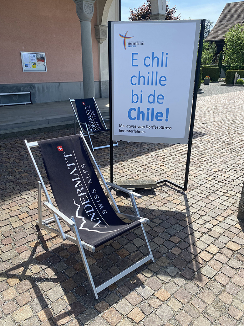 Wem der Trubel auf der Dorfstrasse zu viel war, konnte auf dem Kirchenvorplatz ‚E chli chille bi de Chile‘. Auch das ist Kirche: Einen Schritt zurück machen, zur Ruhe kommen, den Moment geniessen und diesen im Herzen abspeichern.