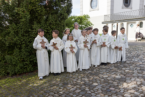 David Pfammatter begrüsste die Anwesenden und erzählte mit der Emmaus-Geschichte, dass Jesus mit ihnen auf dem Weg ist und sie wie ein guter Freund auf ihrem Weg durchs Leben begleitet. Schon bald durften sich die Kinder um den Altar aufstellen, so dass sie ganz nahe miterlebten, wie das heilige Brot in der Gemeinschaft zu etwas Besonderem wurde. Ehrfürchtig und mit Stolz bekamen sie das heilige Brot und durften sich in der Gemeinschaft aufgehoben fühlen.