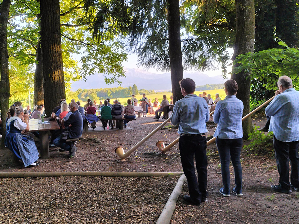 Die Feier wurde von Alphorn-Trio Seppi Bucher, Vreni Herger und Bruno Stadelmann, sowie dem Trachtenchor musikalisch umrahmt. Beim gemütlichen Zusammensein bei Kaffee und Kuchen klang die Feier an diesem lauschigen Abend langsam aus.