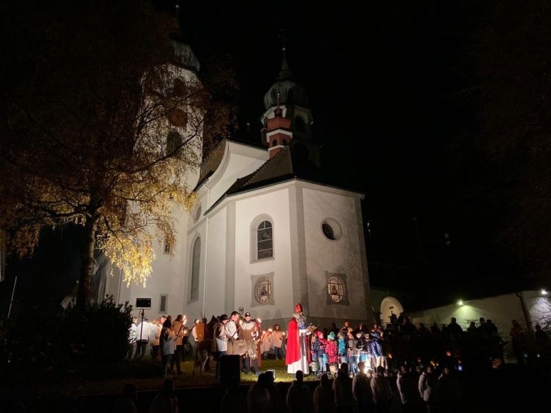 Dass da ein Unterschied ist zum Hl. Nikolaus und dem Weihnachtsmann und bei uns halt alle beide Samichlaus heissen wissen wir nun. Einen schöner Moment war es als die Kinder mit ihren leuchtenden Latärnli begleitet vom Latärne-Lied zur Kirche hinaus zogen. Von weitem hörte man schon die Geisslechlöpfer und Trichler. Im Gleichschritt liefen sie voraus und machten den Weg frei für den Nikolaus. Einfach wunderbar, wie der Samichlaus mit dem Eseli dann oben stand und so gute Worte zu den Kindern und Erwachsenen gesagt hat, umringt vom Licht der Latärnli, Fackeln, Iffele-Träger, Diener und Diennerinnen. Auch die Basisstufen Kinder vom Hübeli haben sich vorbereitet: S›Lied vom Stärn und stellvertretend haben drei Gruppen je ein Sprüchli aufgesagt. Nicht nur der Samichlaus freute sich darüber!