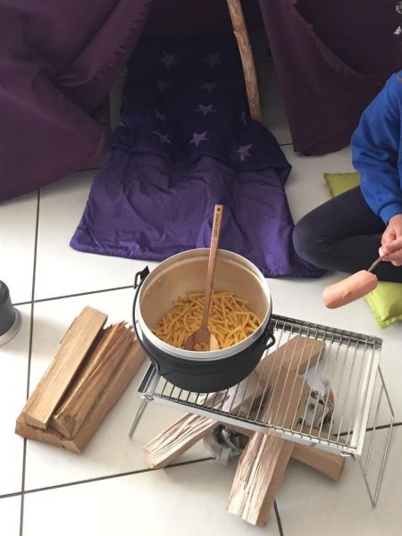 - Kocht ein Menü über dem Feuer
