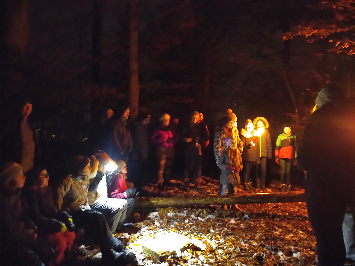 Die drei Musiker, das Rentier mit der Rassel, die Eule mit dem Triangel und der Bär mit der Trommel, freuten sich auf das Wiedertreffen nach dieser langen Zeit ohne gemeinsames Musizieren. Alle Teilnehmenden marschierten los, um für die grosse Party Dekorationen zu basteln. Beim ersten Posten durften sie ein kleines Säckli weihnachtlich mit Glitzer, Stempel, Kleber und Farbe verzieren. Daraufhin bastelten alle ein Wunschkerzli, bei dem sie unter der Kerze einen Wunsch versteckten, welcher erscheint, wenn die Kerze angezündet wird und der Wachs flüssig wird. Dieses durften die Teilnehmenden in das verzierte Säckli verpacken. Im Wald gab es einen kreativen Posten. Dabei durften die Pfadi-Begeisterten Waldmaterialien sammeln und an die grosse Willkommensgirlande hängen. Beim Kommunikationsposten lernten alle einiges über die Porta-Sprache, über Morse-Zeichen und über das Büchsen-Telefon kennen. So konnten sie lernen, auf andere Weisen zu kommunizieren.
