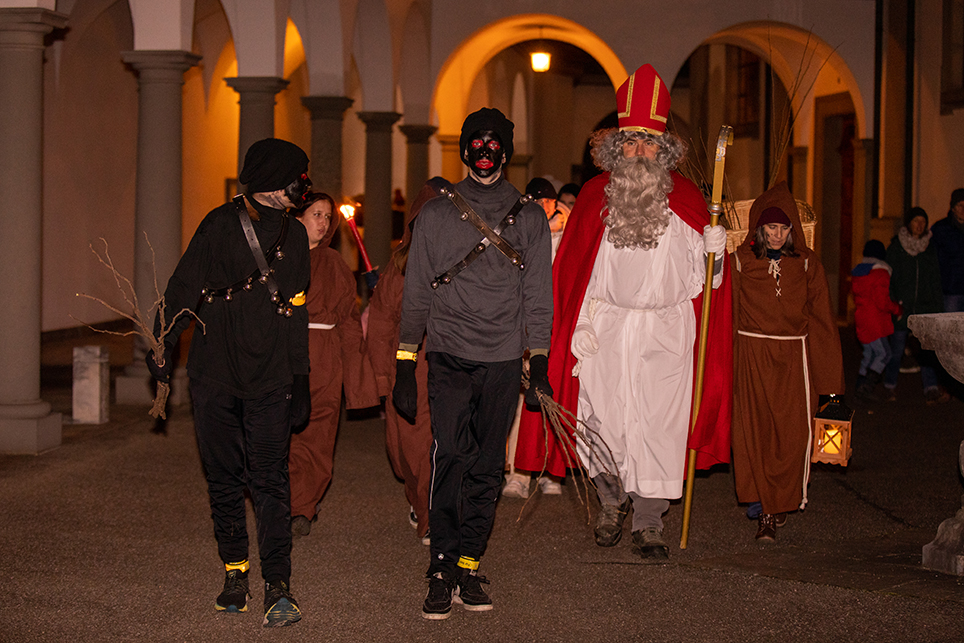 Nach einer feierlichen Einstimmung in der Kirche, welche begleitet wurde von Versen und Liedern, haben sie draussen gespannt auf den Samichlaus gewartet. Dieser kam mit seinem ganzen Gefolge vom Hiltigwald her. Schon von Weitem hörten die mehr als 300 wartenden Zuschauer an der Bahnhofstrasse die Trychler. Der Samichlaus wurde zudem von vielen Fackelträgern, Dienern und natürlich von einigen Schmutzlis begleitet – selbst seinen Esel hat er mitgenommen. Die Kinder leuchteten dem Samichlaus schliesslich den Weg durch die Menge bis hinauf auf die Kirchenmauer. Dort richtete er, umrahmt von der gesamten Gefolgschaft, einige schöne und sinnliche Worte zur Weihnachtszeit an die ganze Gemeinde. Anschliessend nahm sich der Samichlaus viel Zeit, damit er jede einzelne der gebastelten Laternen bestaunen konnte. Die Kinder nutzten die Gelegenheit, den Samichlaus persönlich zu begrüssen und ihm das eingeübte Versli zu erzählen.