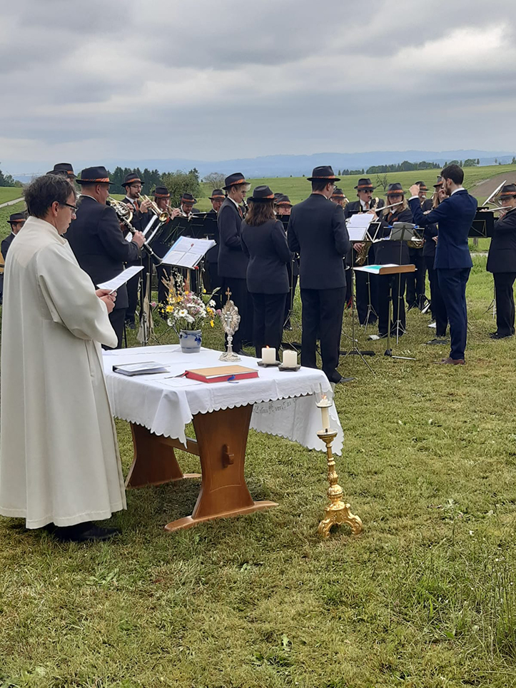 Nach einer kurzen Verschnaufpause startete um 10.00 Uhr der Auffahrtsgottesdienst draussen vor einem grossen Kreuz bei bewölktem, aber trockenem Wetter. Dieser klang mit einem Ständli der Musik, einem Apéro und einem Schwatz im gemütlichen Rahmen aus. Vielen herzlichen Dank allen Beteiligten, voran der Musikgesellschaft Inwil und der Familie Scherer.
