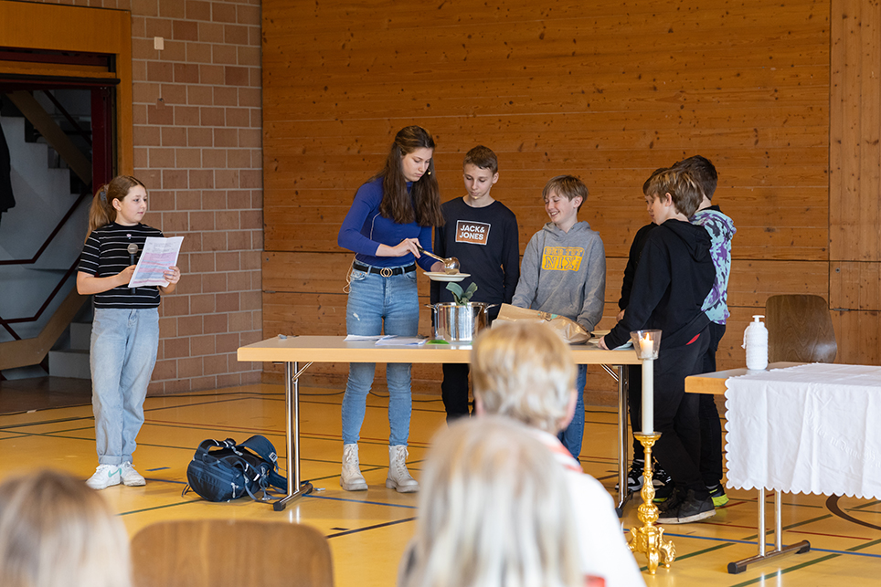 Beteiligt am Gottesdienst waren sieben Kinder/Jugendliche aus Inwil. Sie haben die Geschichte von der Steinsuppe als Rollenspiel auf anschauliche Art und Weise vorgespielt. So wurde allen Anwesenden klar, dass wenn alle ihren Teil beitragen, etwas ganz Besonderes entstehen kann. Das Chinderfiir-Team hat eine Kinderbetreuung angeboten. Die kleinen Besucher durften in Anlehnung an die vorgetragene Geschichte eigene Suppensäckli bemahlen und befüllen.