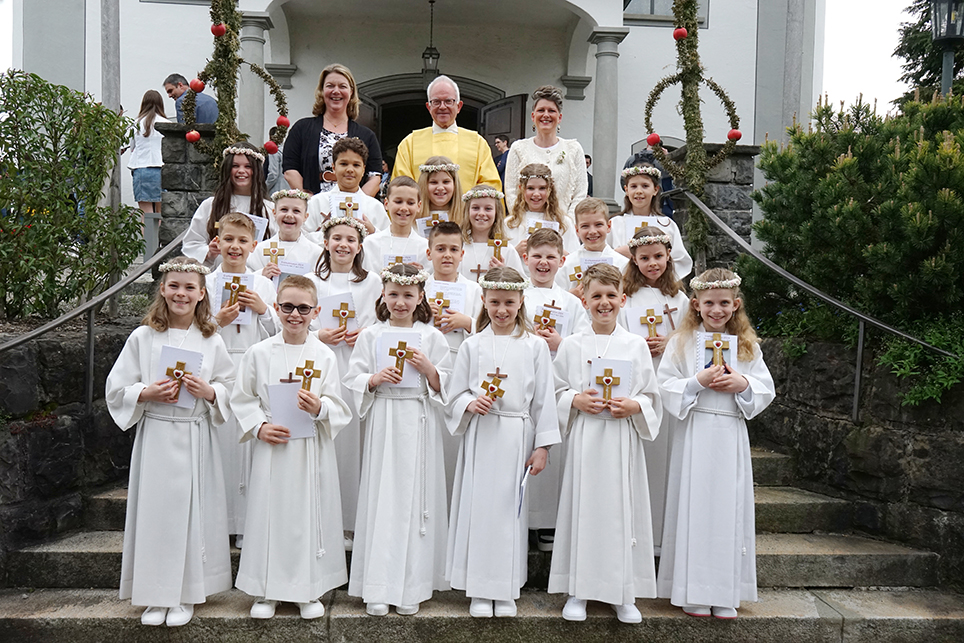 Das Thema: «Jesus i mim Härz» stand im Mittelpunkt dieser Feier. Im Festgottesdienst wurde erklärt, wie Jesus in unser Herz kommt. Jesus prägt unsere Entwicklung und hat so direkten Einfluss auf unser «Menschsein». Mit ihm als Vorbild und mit seiner Kraft, kann unser Leben bereichert werden. Mit Jesus in unseren Herzen, sind wir voller Hoffnung, Kraft, Liebe, Vertrauen, und Freude unterwegs und können all dies an unsere Mitmenschen weitergeben. Die Erstkommunikantinnen und Erstkommunikanten haben den Mitfeiernden selbst erklärt, wie wir Jesus in unser Herz lassen können. Als die Erstkommunikant:innen von Priester Christoph Sterkman zum ersten Mal das heilige Brot bekamen, sah man an den strahlenden Augen, dass die Kinder mit ganzem Herzen, die Freude und die Liebe unseres Glaubens in sich tragen und Jesus ganz nahe sind.