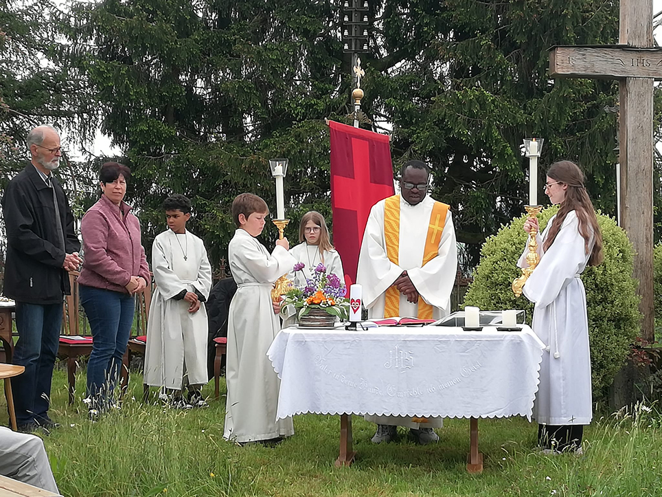 Auf dem Hof Budligen angekommen, feierten alle «Pilgerer» zusammen die Eucharistie mit unserem Priester Polycarp. Die Feier wurde musikalisch umrahmt von der Musikgesellschaft Inwil. Am Schluss offerierte Familie Scherer etwas zu trinken. Ein herzliches Dankeschön der Musikgesellschaft Inwil, Familie Scherer für die Gastfreundschaft und allen Mitwirkenden für den schönen Gottesdienst.