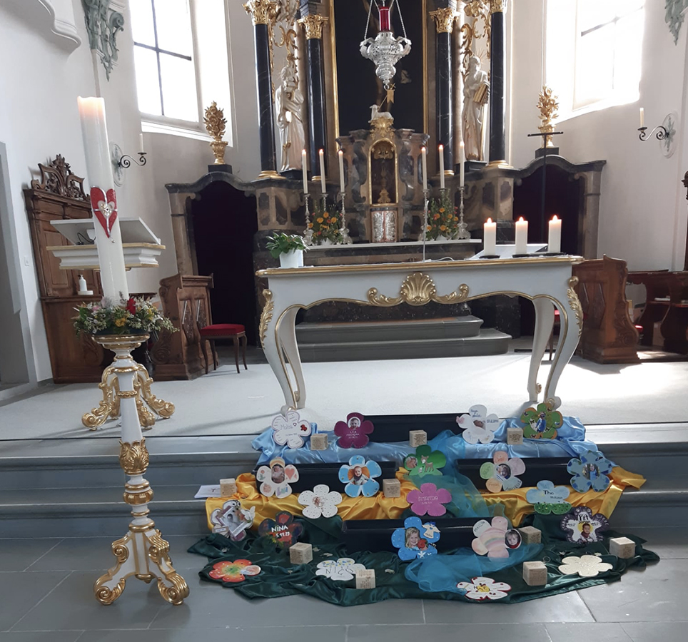 Der Gottesdienst stand unter dem Motto «Hände» und so begleiteten uns sowohl Marco Kunz (Chliini Händ) wie auch Yves Duteil (Prendre un enfant par la main), ergänzt durch den Organisten Giuseppe Murena, musikalisch durch die Feier. Biblisch stand ein Abschnitt aus Jesaja 49 im Zentrum (Ich vergesse dich nicht. Sieh her: Ich habe dich eingezeichnet in meine Hände). Bei der Blütenrückgabe wurde wiederum von den Eltern eine Schwimmkerze mit einem guten Wunsch entzündet und das eigene Kind mit Weihwasser gesegnet. Bei Käse, Brot, Knabbereien für die Kinder und Getränken, organisiert vom Pfarreirat, klang die Feier im Centrum Candidus aus.