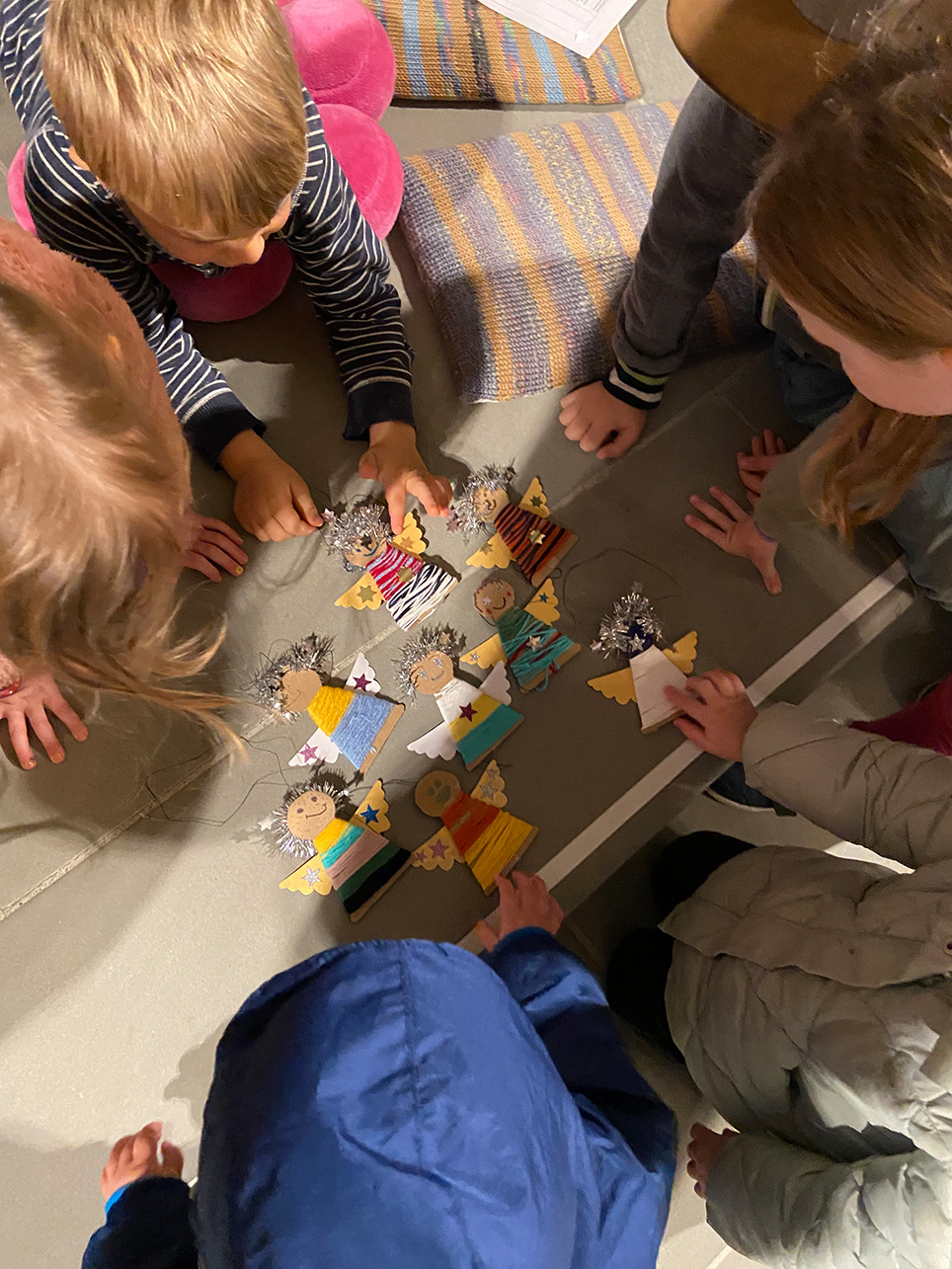 Nach einer kurzen Begrüssung sangen wir das „Hey hey hey“ Lied, das an jeder Chinderfiir gesungen wird. Wie die letzten Jahre durfte auch dieses Jahr wieder ein Kind die erste Kerze am Adventskranz anzünden. Der Höhepunkt der Feier war die spannende Erzählung einer Geschichte über einen Schutzengel. Dabei durften sich die Kinder auf bunte Kissen setzen und gespannt lauschen. Damit sie immer wieder an ihren eigenen Schutzengel erinnert werden, durften sie einen solchen auch gleich selber basteln und als Erinnerung nach Hause nehmen. Die Kleinen lernten, dass sie nie alleine sind und dass es immer jemanden gibt, der über sie wacht und beschützt.