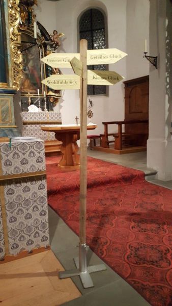 Die Schüler befragten also die Anwesenden nach ihren Glücksmomenten und trugen sie mit Hilfe eines grossen Wegweisers zusammen. Allmählich wurde klar, dass man nicht einfach Kirchtürmen folgen müsse, sondern dass diese alle zum Himmel zeigten. Das Glück liege – so meinte Christoph Beeler-Longobardi später in seiner Ansprache – nicht einfach auf dem Weg. Man müsse Ausschau halten nach dem, was nicht direkt vor der Nase liege. Lieder, Gebete, Gedanken und einiges an Improvisationskunst machten die Wallfahrt zu einem eindrücklichen Nachdenken über das, was im Leben ist wirklich zählt. Bis zum Schlusssegen gabs etliche Gelegenheiten, sich von den Schülern einen Glückskleber in den Pilgerpass kleben zu lassen.