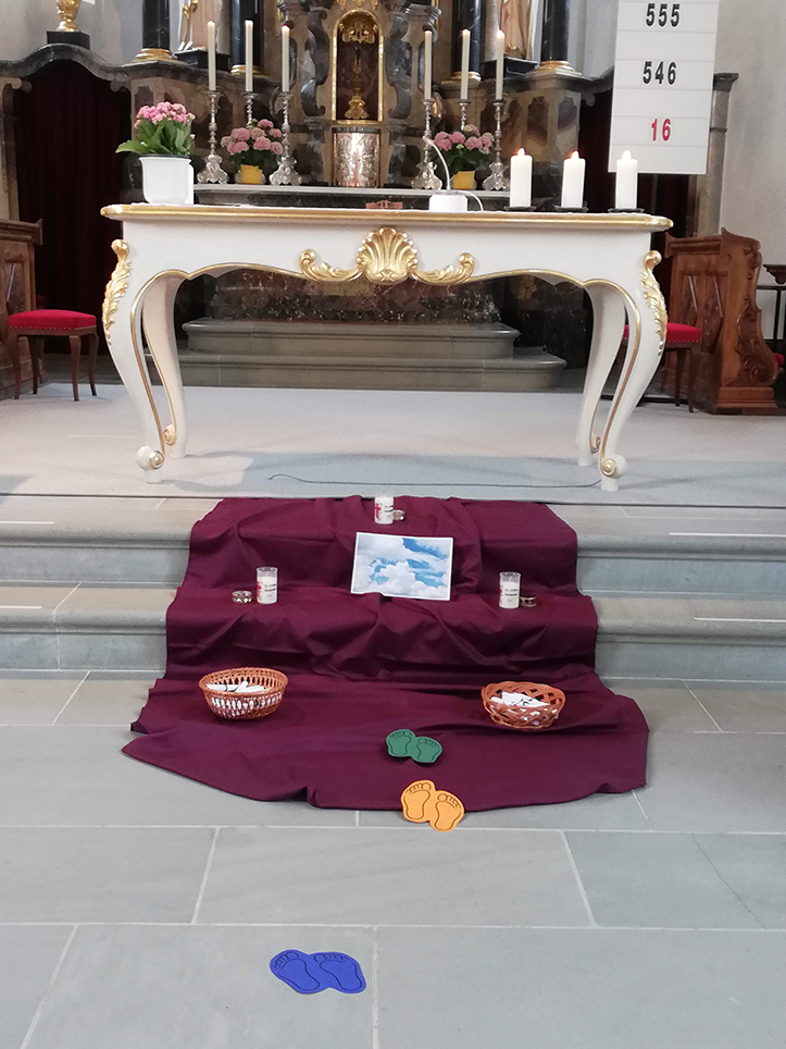 Seit Kindertagen wissen wir, wie gut es tut auf dem Weg begleitet zu werden. Viele Menschen sind auch bis heute mit uns gegangen. Manche nur für einen kurzen Abschnitt, manche auch für eine lange Wegstrecke. Jesus Christus ging von Anfang an bis heute mit uns. In der Geschichte vom Traum, erkannten wir an den Fussspuren, dass uns Gott durch die schweren Zeiten des Lebens trägt. Im Gottesdienst gedachten wir den verstorbenen Frauen unser Pfarrgemeinde, die auch mit uns auf dem Weg waren. Für sie haben wir zu Beginn eine Kerze entzündet, welche im Anschluss der Feier, auf ihrem Grab weiter leuchtete.