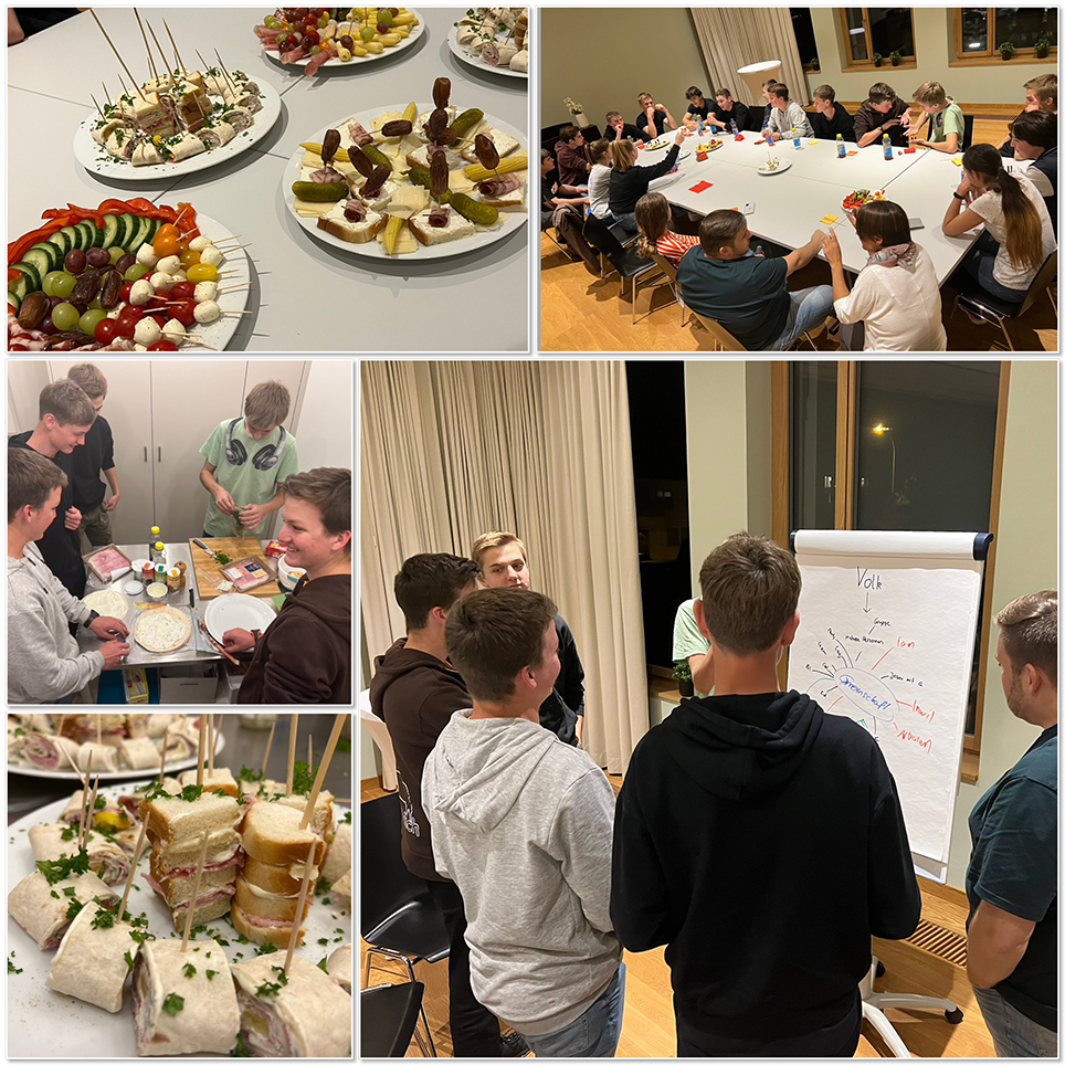 Das Thema für die erste Firmvorbereitung war: «Gemeinschaft». In drei verschiedenen Ateliers wurde dieses Thema erarbeitet. Was ist eine Gemeinschaft? Was braucht es für eine Gemeinschaft? Welche Pflichten zieht eine Gemeinschaft mit sich? All diese Fragen konnten bei einem Brainstorming geklärt werden. Spielerisch konnten die Jugendlichen erfahren, auf was es bei der Wahl der Firmpatin/des Firmpaten ankommt und unter dem Motto: Gemeinsam für die Gemeinschaft, hat jede Gruppe aus wenig Zutaten zwei Apero-Teller gezaubert. Diese wurden dann als Abschluss von diesem Abend gemeinsam genossen.